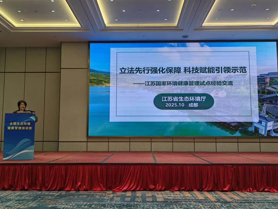近日,由生态环境部法规与标准司指导,中国环境科学研究院主办的2025年度全国生态环境健康管理培训班在四川成都开班,共有4个单位在大会上作交流发言,江苏省生态环境厅应邀交流环境健康管理试点工作经验,厅法规标准与科技处四级调研员荆琳现场分享“江苏做法与成效”。