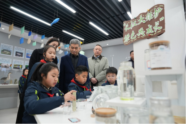 与会嘉宾参观新北区圩塘中心小学学生生态作品展和长江生态馆
