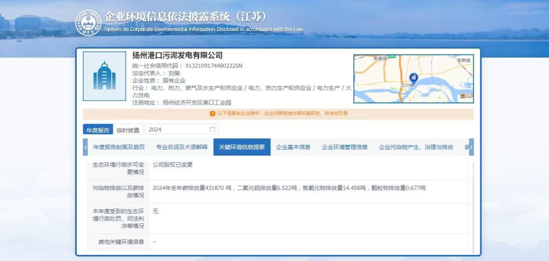 在该系统内,可以找到企业披露的12大类环境数据,主要包括关键环境信息摘要、企业基本信息、企业环境管理信息、污染物产生治理与排放信息、碳排放信息、强制性清洁生产审核信息、生态环境应急信息、生态环境违法信息、本年度临时报告情况、相关投融资生态环保信息等。以扬州港口污泥发电有限公司为例,其关键环境信息摘要里面包括污染物排放以及碳排放情况,其中2024年产生了哪些种类的排放物、排放了多少,都有具体明细。