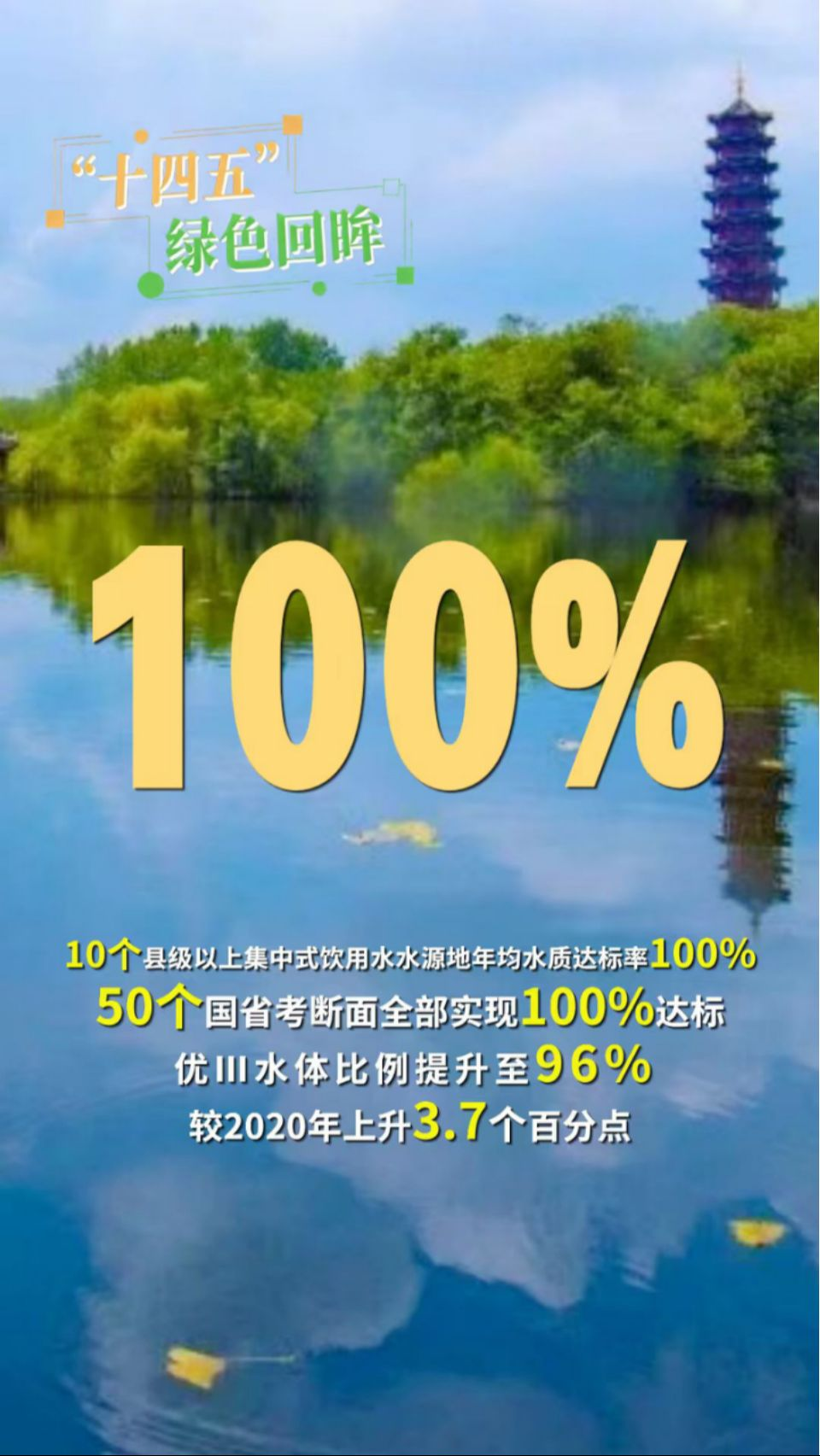 “十四五”期间,宿迁市10个县级以上集中式饮用水水源地年均水质达标率100%,50个国省考断面全部实现100%达标,优Ⅲ水体比例提升至96%,较2020年上升3.7个百分点。