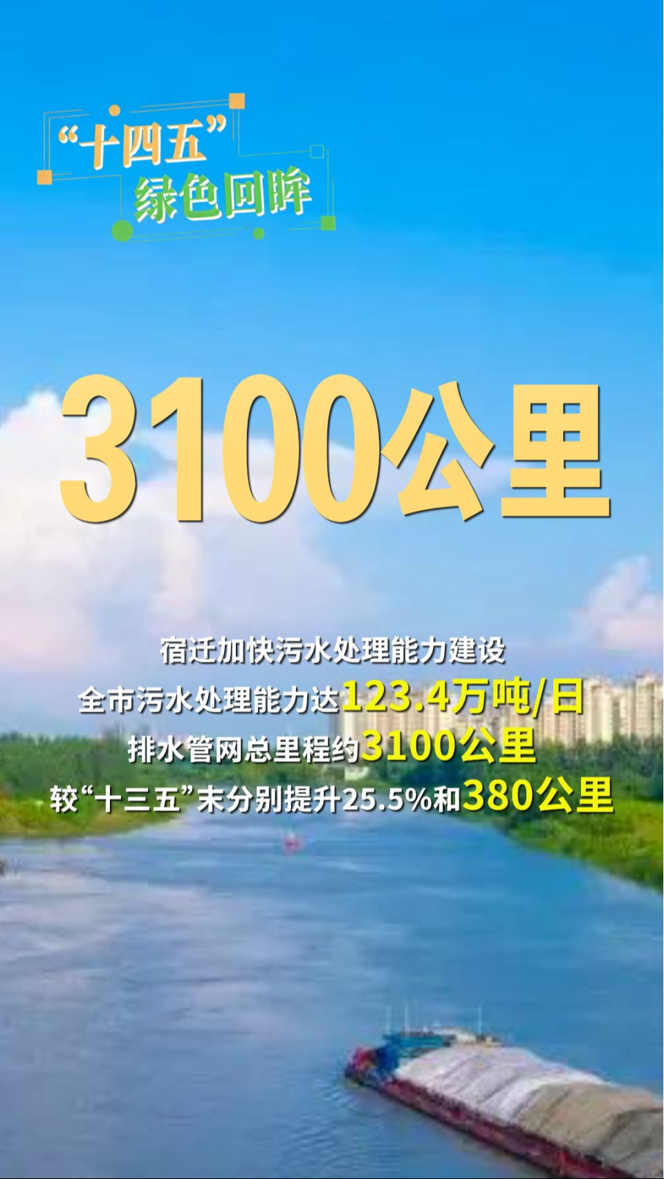 “十四五”期间,宿迁市排定实施约89项涉水生态环境基础设施工程,共计投入约39.63亿元,全市污水处理能力达123.4万吨/日,排水管网总里程约3100公里,较“十三五”末分别提升25.5%、增加380公里。