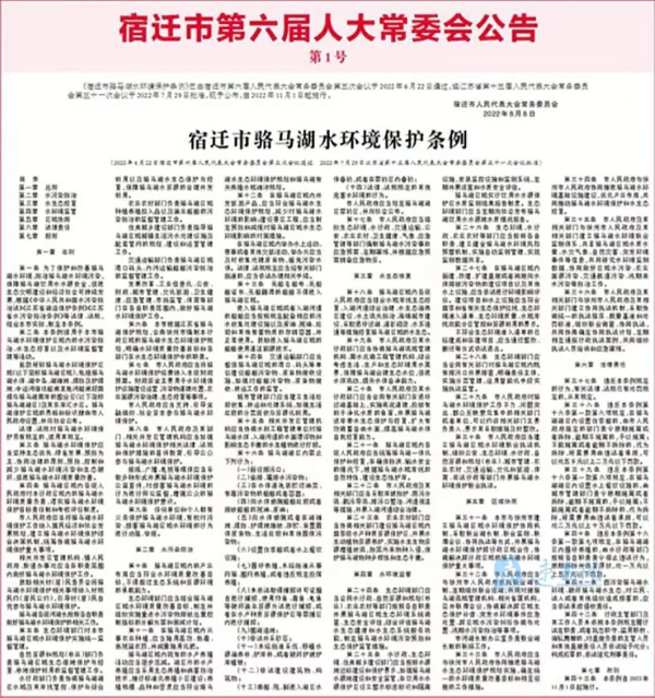 在湖泊治理上,宿迁市通过与徐州市协同立法,颁布实施《宿迁市骆马湖水环境保护条例》,开创跨区域湖泊保护法治化新局面,为“两湖”共保联治提供了坚实的法治保障。