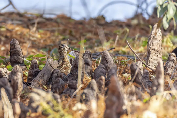 “本应在夜晚活动的丘鹬,竟然在白天现身了!”近日,鸟类观察员徐斌在白塘公园荷花池边一个铺满落叶与枯草的小岛上,敏锐捕捉到一抹几乎与环境融为一体的棕褐色精灵。那是一只丘鹬,正用标志性长喙,悠闲地在松软的泥土中翻找食物。“它的伪装太好了,要不是偶尔动一下,眼神差一点根本发现不了。”徐斌说。