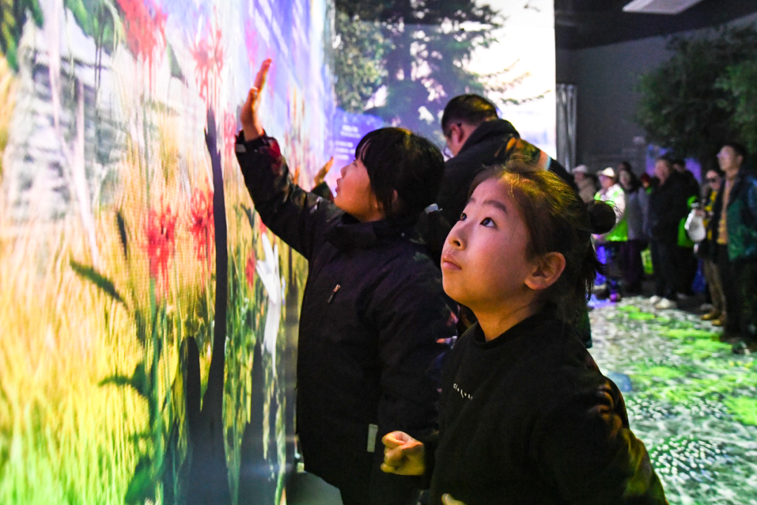 在沉浸式交互影厅,孩子们通过《羽翼之下》影片,见证了月牙岛从荒芜堆场蜕变成草木葱茏的湿地乐园。大家还通过拍打墙壁与投影中的动植物“互动”,解锁了震旦鸦雀、白琵鹭等珍稀鸟类的秘密,也在心中种下了探索自然的种子。