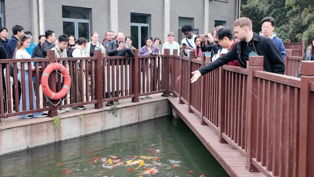 在南京钢铁集团与杏湖公园,中外青年们重点参观了“同心圆”景观。昔日废弃的水泵站,如今蝶变为水清岸绿的生态园区,近4万平方米的九龙湖水波荡漾,鱼儿在水中自在游弋。园区内还藏着一处小型“生态乐园”,孔雀、梅花鹿、松鼠等小动物与游人和谐相伴,生动展现出工业文明与自然生态共生共融的美好图景。曼彻斯特大学学生Haytham感叹:“我特别喜欢这种自然生态与工业建筑的巧妙融合,园区内开阔的滨水空间更是令人震撼。”