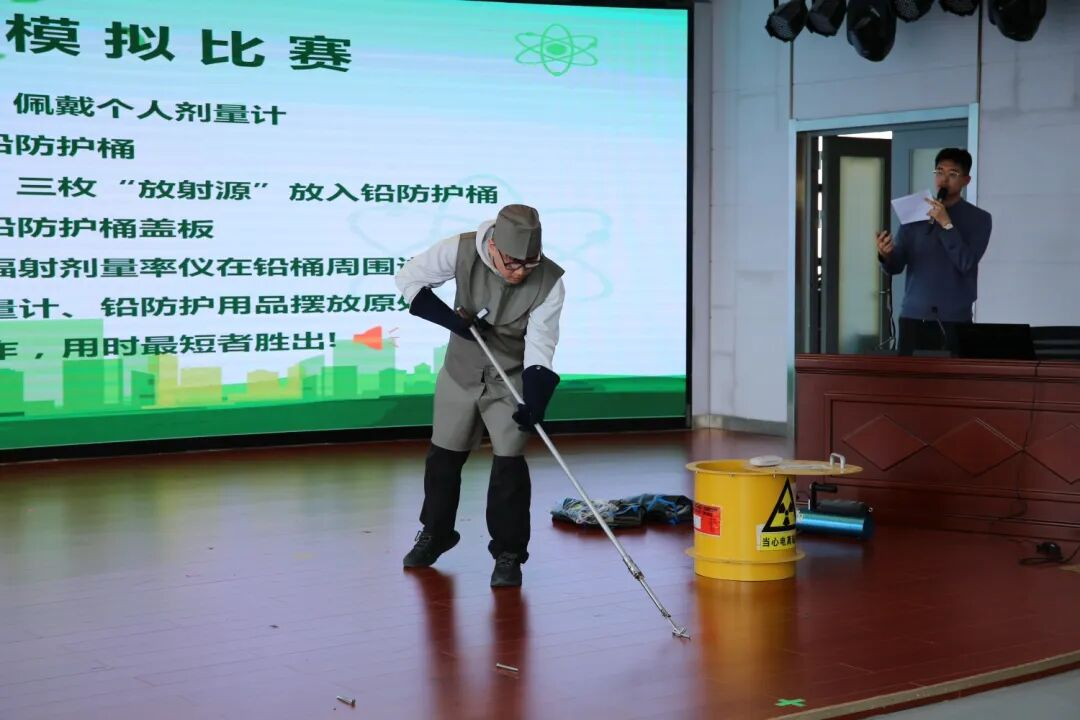 最热闹的当属“放射源处置”模拟演练。参与演练的学生穿戴好铅衣、防护手套,手持长柄工具,小心翼翼地接近地上散落的“模拟源”——特殊标记的螺丝钉。在技术人员的指导下,他们尝试应用“时间—距离—屏蔽”的防护原则来完成放射源处置。