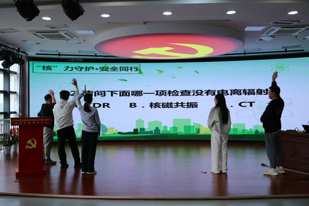 核安全知识竞猜环节依旧气氛热烈。“医院电子加速器机房周围居民年均剂量限值是多少”“下列哪种生活行为受到的辐射剂量最高”20道抢答题涵盖了讲座中的核心知识点,学生们争相举手、积极应答,在轻松热烈的互动中巩固所学、深化理解。