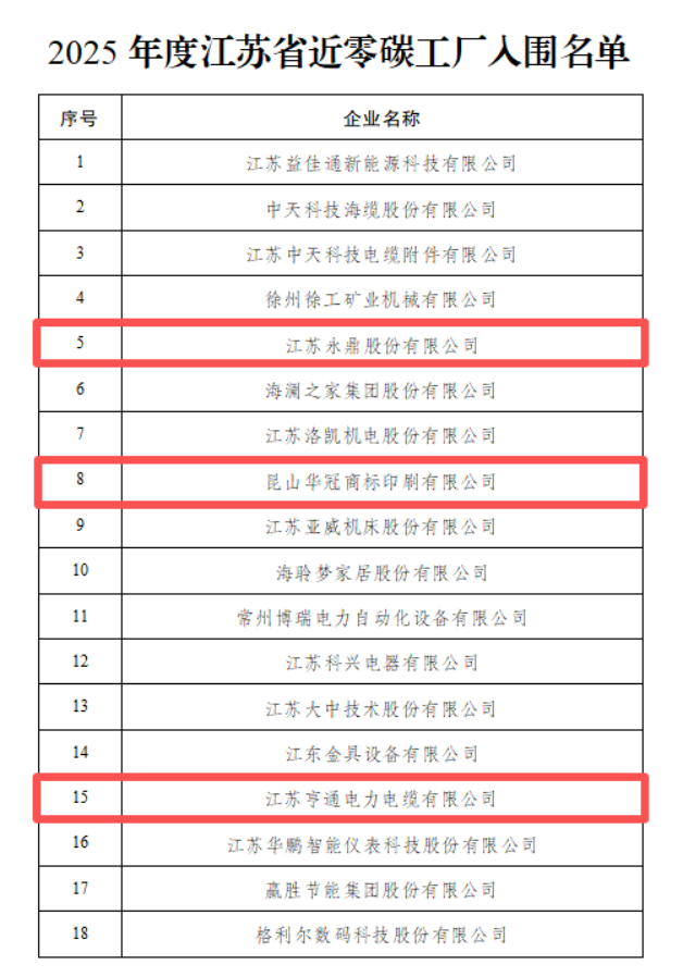 江苏永鼎股份有限公司、昆山华冠商标印刷有限公司、江苏亨通电力电缆有限公司入围近零碳工厂名单。
