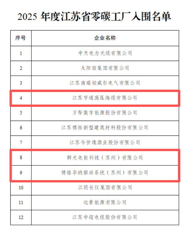 江苏亨通高压海缆有限公司、群光电能科技(苏州)有限公司、博格华纳驱动系统(苏州)有限公司入围零碳工厂名单。