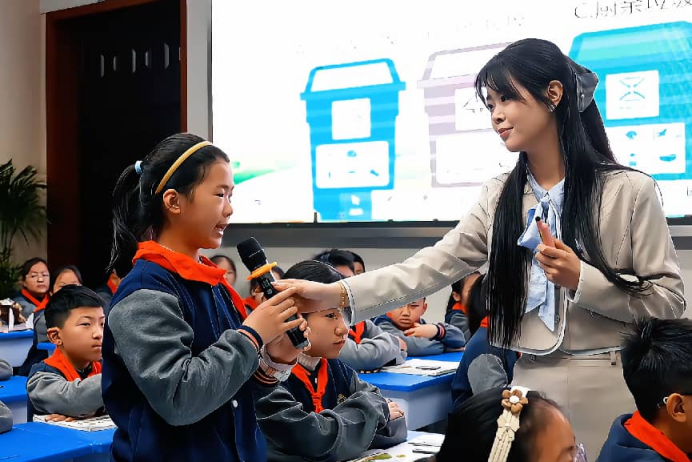 活动现场,四节生态文明跨学科展示课同步开讲:报告厅内,四年级学生探索“变废为宝”的绿色智慧;实验室里,三年级 “小小研究员”揭秘海洋污染真相;STEM 教室中,二年级孩童跟随 “滴滴”开启水资源之旅;美术室里,四年级学子用艺术与科技对话“风光互补”路灯,呈现生态教育与多学科深度融合的无限可能。