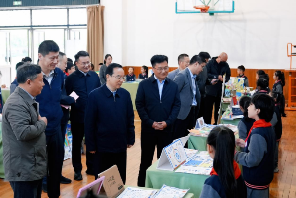 活动伊始,与会嘉宾参观全校生态文明教育成果展。建宁小学66个教学班、一至六年级全体学生均以丛书为蓝本,自主选择感兴趣的生态主题开展学习与探究,形成覆盖全学段、全员参与的生态育人格局。数字气象站、雨水回收系统、风光互补路灯等校园生态载体,搭配学生围绕 “水、土、气、生物” 创作的各类生态实践研究作品、生态手账与模型,生动呈现了“知行创合一”的育人理念,让抽象生态理念转化为可感、可触、可参与的成长体验。