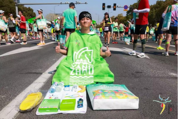 本届赛事首次打造“碳中和”扬马,推出多项创新环保举措:特设“不存包”绿色参赛选项,选手报名时自主勾选,赛前领取专属标识,完赛即可获得专属保温披风。来自广西贺州的“80后”选手唐思危凭借1小时27分40秒的成绩打破“130”大关,冲线后便身披这款无存包斗篷,亮眼的绿色披风吸引了众多跑者驻足咨询,也让绿色参赛的理念在赛场内传递。